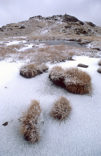 Grass tufts on peat in a frozen tarn covered with a sprinkling of snow, near the summit cairn of Place Fell