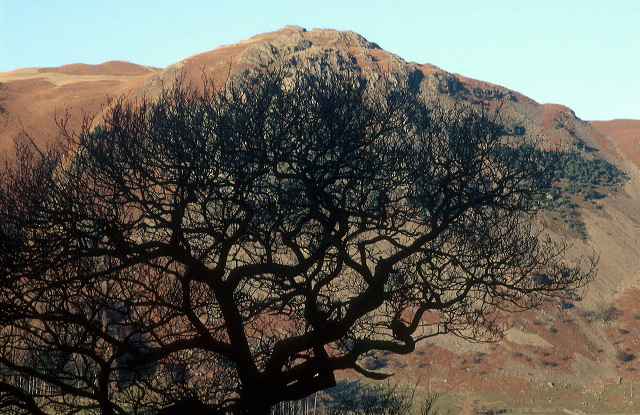 Silhouette of a leafless tree against a distant sunlit fell, seen from the low-level path from Patterdale to Hartsop