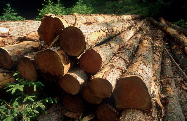 Logging in Ennerdale Forest: a pile of stripped treetrunks waiting in the summer sun for transport