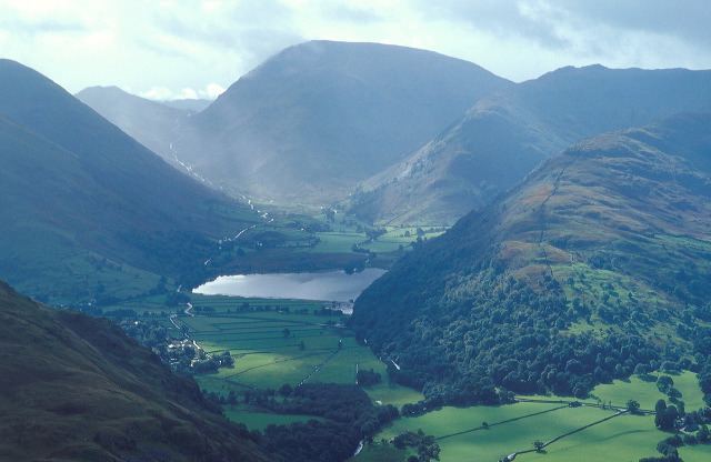 The distinctive square shape of Brothers Water from Place Fell, over Patterdale, with Kirkstone Pass in hazy sun in the distance