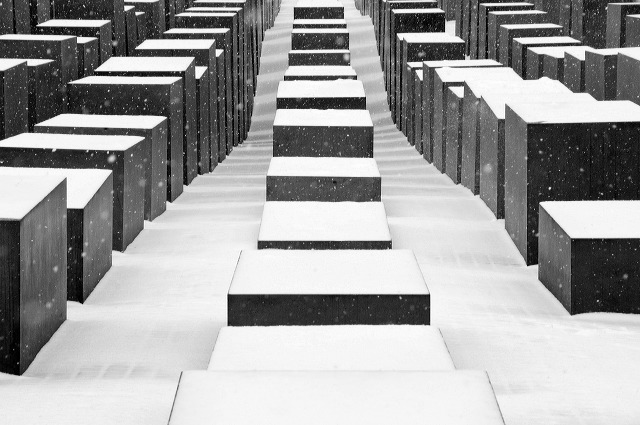 Memorial in Snow. Another image from my on-going project based around the Memorial to the Murdered Jews of Europe (Denkmal für die ermordeten Juden Europas) in Berlin – usually referred to as the 'Holocaust Memorial' – this time from my third visit in January 2013. This 'field of stelae' – designed by American architect Peter Eisenman – is set on an undulating site about 100 metres south of the Brandenburg Gate. It opened in 2005 after a long and often controversial planning and building process. The 2,711 concrete blocks (stelae) are arranged in a regular grid over an area of nearly five acres. Each is around 8 feet long and 3 feet wide, but they vary in height from a few inches up to nearly 16 feet. At first the arrangement looks uniform, but closer inspection shows that each block is at a slight angle to its neighbour, creating a feeling of uncertainty.