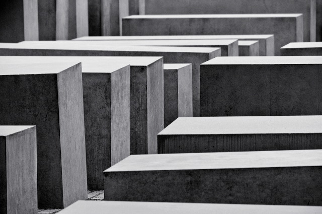 Holocaust Memorial, Berlin. Officially called the 'Memorial to the Murdered Jews of Europe' (Denkmal für die ermordeten Juden Europas) but usually referred to as the 'Holocaust Memorial', this 'field of stelae' – designed by the American architect Peter Eisenman – is set on an undulating site 100 metres south of the Brandenburg Gate, in the centre of Berlin. It opened in 2005 after a long and often controversial planning and building process. The 2,711 concrete blocks (stelae) are arranged in a regular grid over an area of nearly five acres. Each is around 8 feet long and 3 feet wide, but they vary in height from a few inches up to nearly 16 feet. At first the arrangement appears uniform, but closer inspection shows that each block is at a slight angle to its neighbour, creating a feeling of uncertainty.