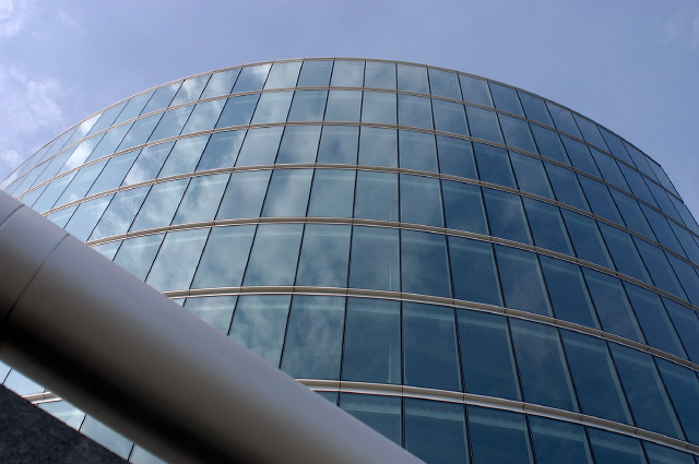 Windows. Looking up at the glass-fronted building near London's City Hall, by Tower Bridge, with a strategically-placed handrail upsetting the symmetry in the foreground. The glass reflects the sky but gives it a slight green colour shift. Perspective lines and curves.