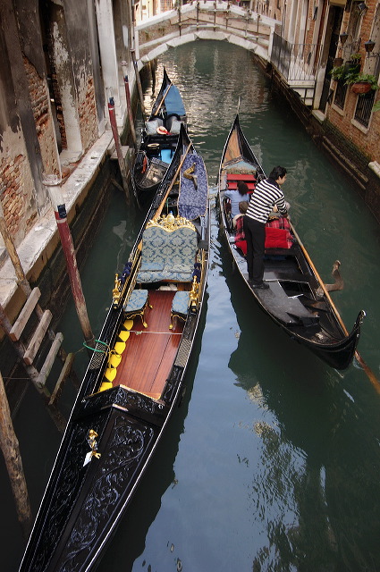 Gondolas passing in a narrow canal in Venice, Italy, with a bridge in the background; one moored, the other with a gondolier.