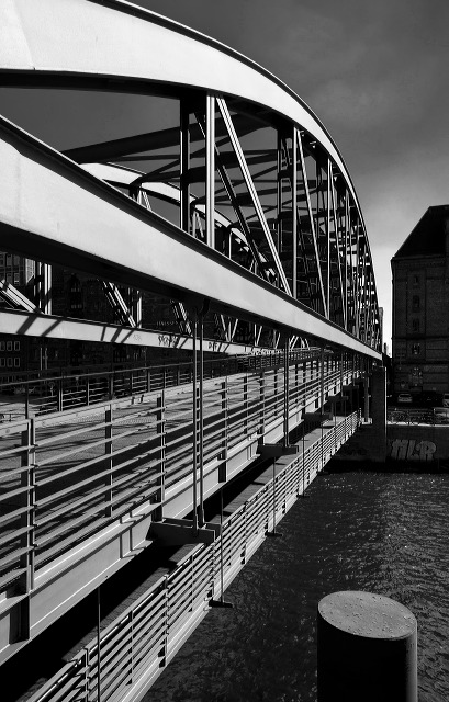 The Bridge. The strong lines of a bridge over the Zollkanal in Hamburg, Germany, benefitting from some strong early afternoon sun to provide stark contrast. The top of the mooring post in the bottom right corner nicely fills the space and provides some balance. In the conversion to monochrome I darkened down what had been a lightish blue sky to emphasise the curve of the steelwork, and also took the building on the right almost down to black to take out any distraction and provide a good visual anchor at the end of the bridge.