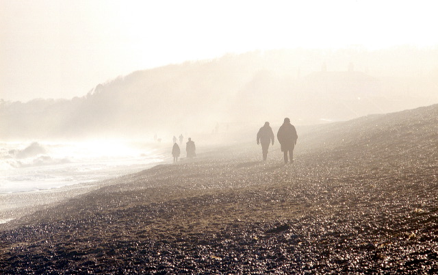 On The Beach. On the shore at Dunwich on the East Anglian coast, on New Year's Day 2001. A sudden burst of sunshine lasting only a few minutes. Luckily I had a 200mm lens on the F3 and had just gone back to fetch a tripod. Time for a dozen shots before the light went, as the groups of people (and one or two dogs) walked towards me; this was number 11, about the only one where the foreground couple is large enough in the frame to be a centre of interest, and there are no serious overlaps of the figures in the distance.